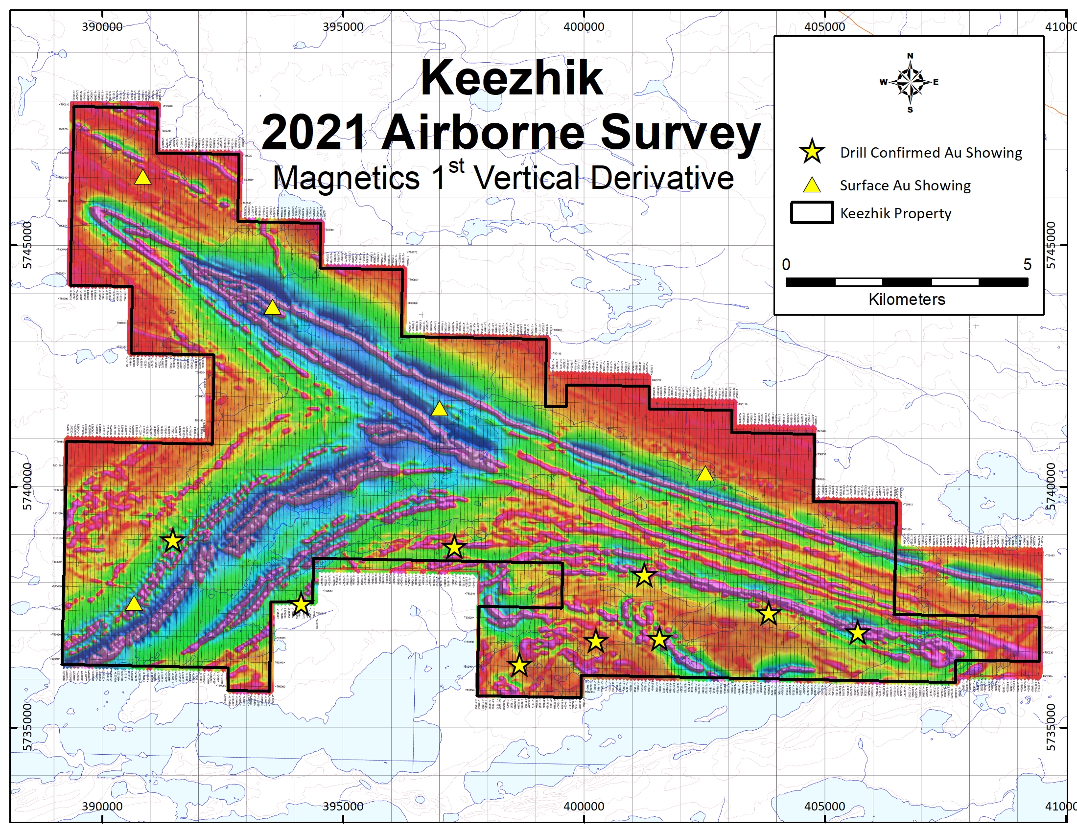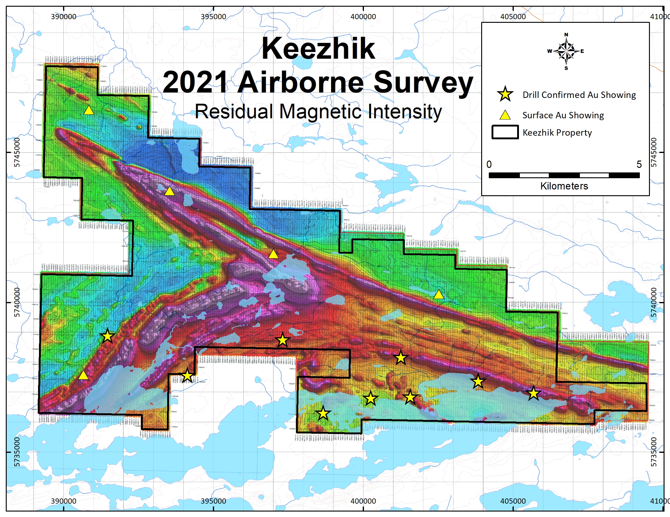 The Keezhik property lies within the Miminiska-Fort Hope greenstone belt and adjacent to the North-Caribou – Totogan Shear Zone which is host to Newmont Corporation’s Musselwhite Gold mine, approximately 150 kilometres to the northwest. Historical work has identified several zones of gold mineralization on the property.