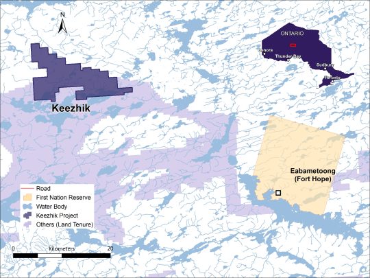 The Keezhik Project is located approximately 380 km north of the city of Thunder Bay and within the traditional territory of the Eabametoong First Nation. The project comprises 570 mineral claim cells covering 12,482 ha and is accessible by float plane.